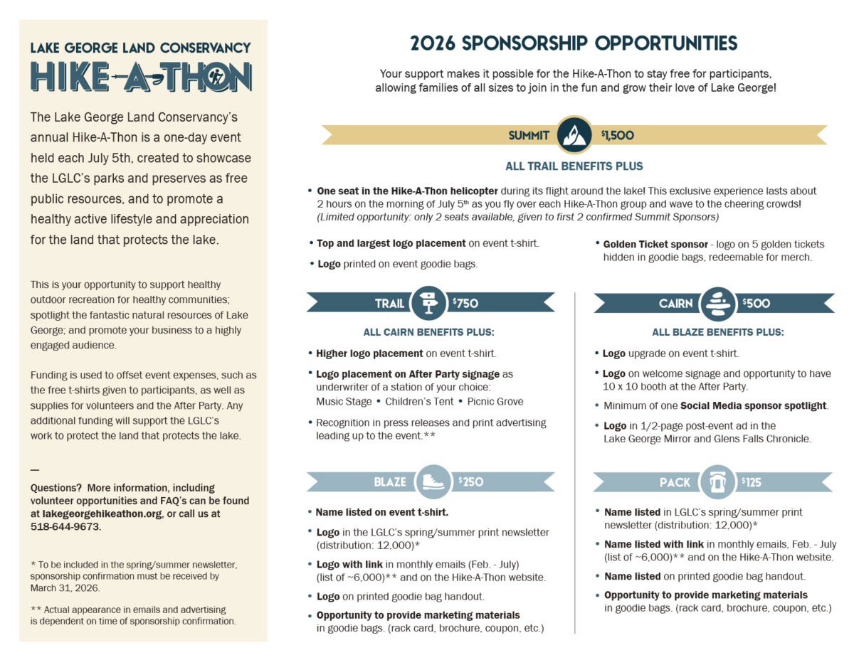 Sponsors make it possible for the Lake George Hike-A-Thon to stay free for participants, allowing everyone to join in the fun, regardless of means. Combined with the annual in-kind support from Carl Heilman, II/Wild Visions, Inc. and Bruce Mowery/North Country Heliflite, these contributions allow us to provide a safe, fun and educational event year after year!